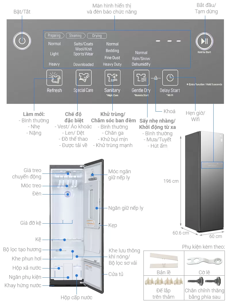 Sản phẩm có 4 chương trình chính tiện lợi bao gồm: làm mới quần áo, chăm sóc đặc biệt, khử trùng, sấy khô nhẹ nhàng. (xem chi tiết tại bảng thông số kỹ thuật). Ngoài ra, máy còn có các chức năng bổ sung và cho phép tải về các chương trình hoạt động khác thông qua ứng dụng LG Thinq.